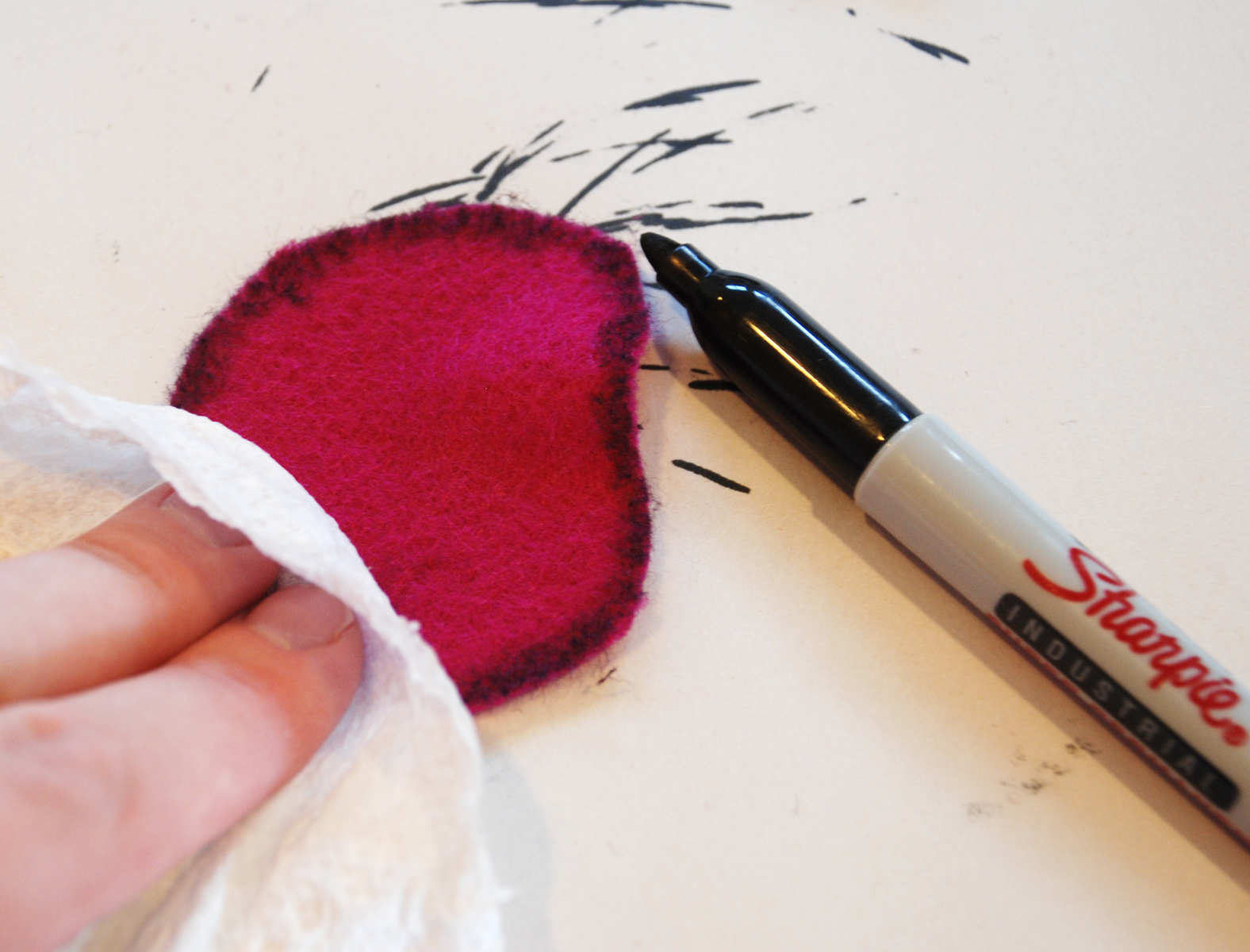 Burned Edges: When the fabric paint was completely dry I used a black Sharpie marker to add a burned look to the edges of the felt. I carefully rubbed the marker along all the edges of the “lava”. Next I added marker to the outside edges of the lava rock pieces and main felt piece. I used a paper towel to keep my finger tips from getting black while I held the small pieces.