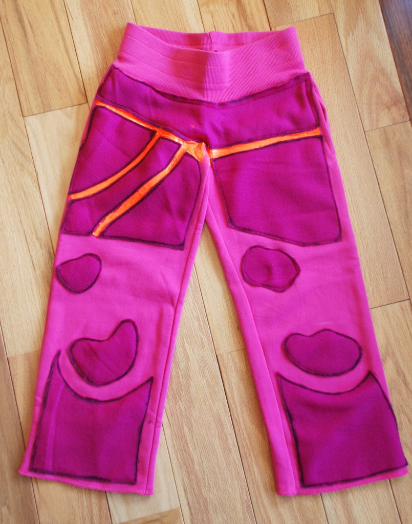 Lava on the Pants: Once all the pieces where cut and pinned in place I sewed all the pieces onto the pants. Next I used the fabric paint to apply lava to the pants. When I was finished I set them aside to dry overnight.