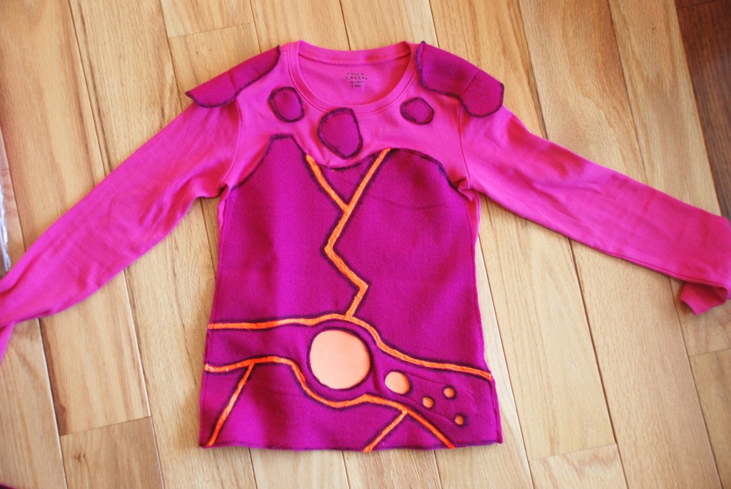 The Belt: To make the “belt” that goes across the shirt, I cut a strip of felt the same width as the main felt piece. I laid the cut rectangular strip on top of the main felt piece and used my chalk to mark the shape of the belt piece I wanted to cut. I then cut out the belt piece. Next I used the chalk to draw a circle shape in the center of the belt and a series of smaller circle shapes to the right of the center circle. I cut these shapes out with my scissors. To give a belt some dimension I used bright orange foam and cut it slightly smaller than the overall shape of the belt. I laid the foam underneath the belt and pinned it onto the belt. Then I laid the belt in the position I wanted it on the main felt piece and pinned it down (only pin it to the main felt piece, not to the plain shirt). I then sewed the felt belt + foam underneath to the main felt piece. (The main felt piece is still not attached to the plain shirt.)