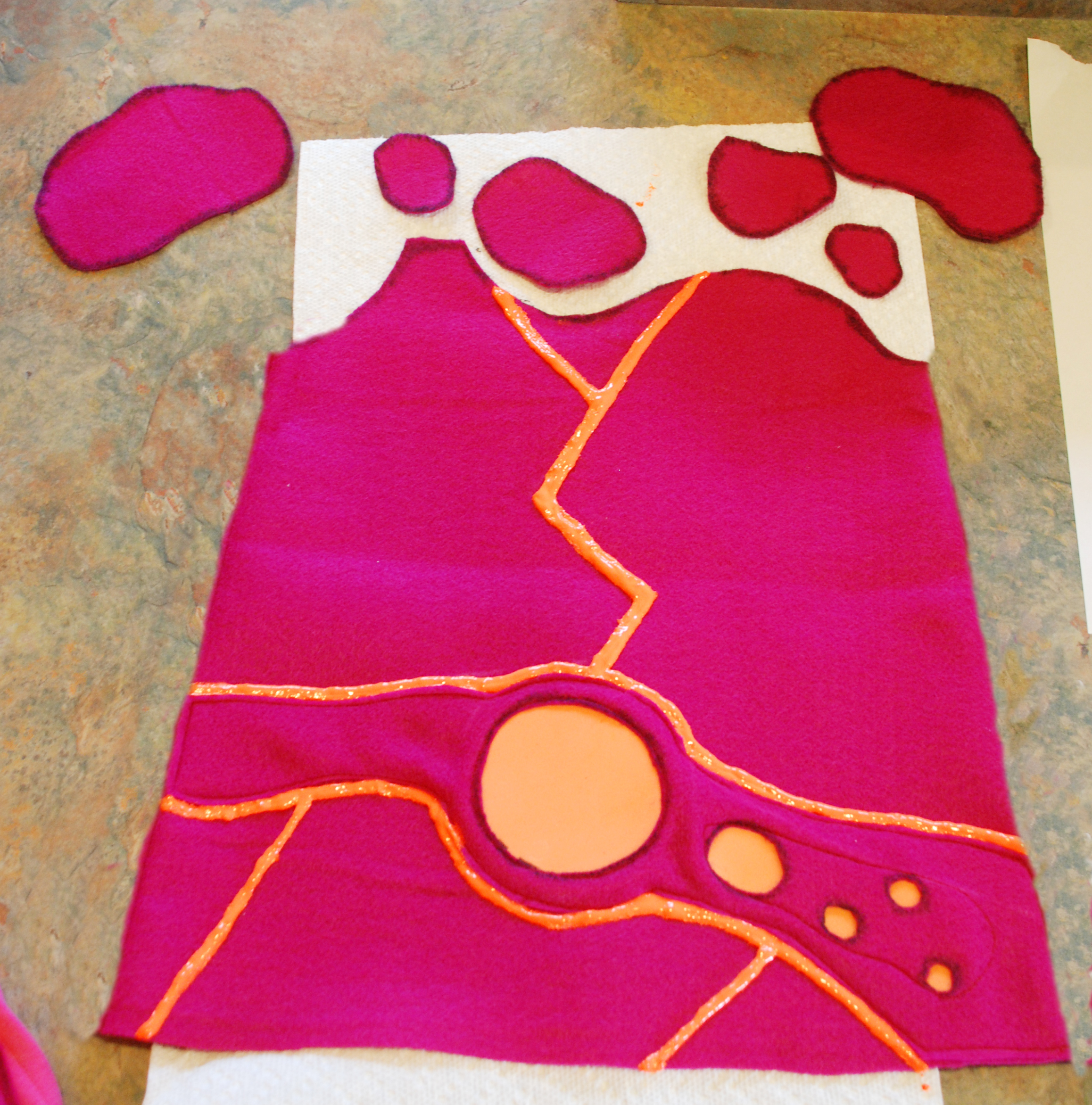 Lava on the Shirt: To add the “lava” to the main felt piece I used my chalk to mark where I wanted the lava to flow. I then carefully started at the top of my main felt piece and applied the fabric paint to the correct spots on the felt. I was careful to work from top to bottom and then left to right so that my hand did not smear any of the fabric paint I had already applied. Set this piece aside to dry, preferably overnight.