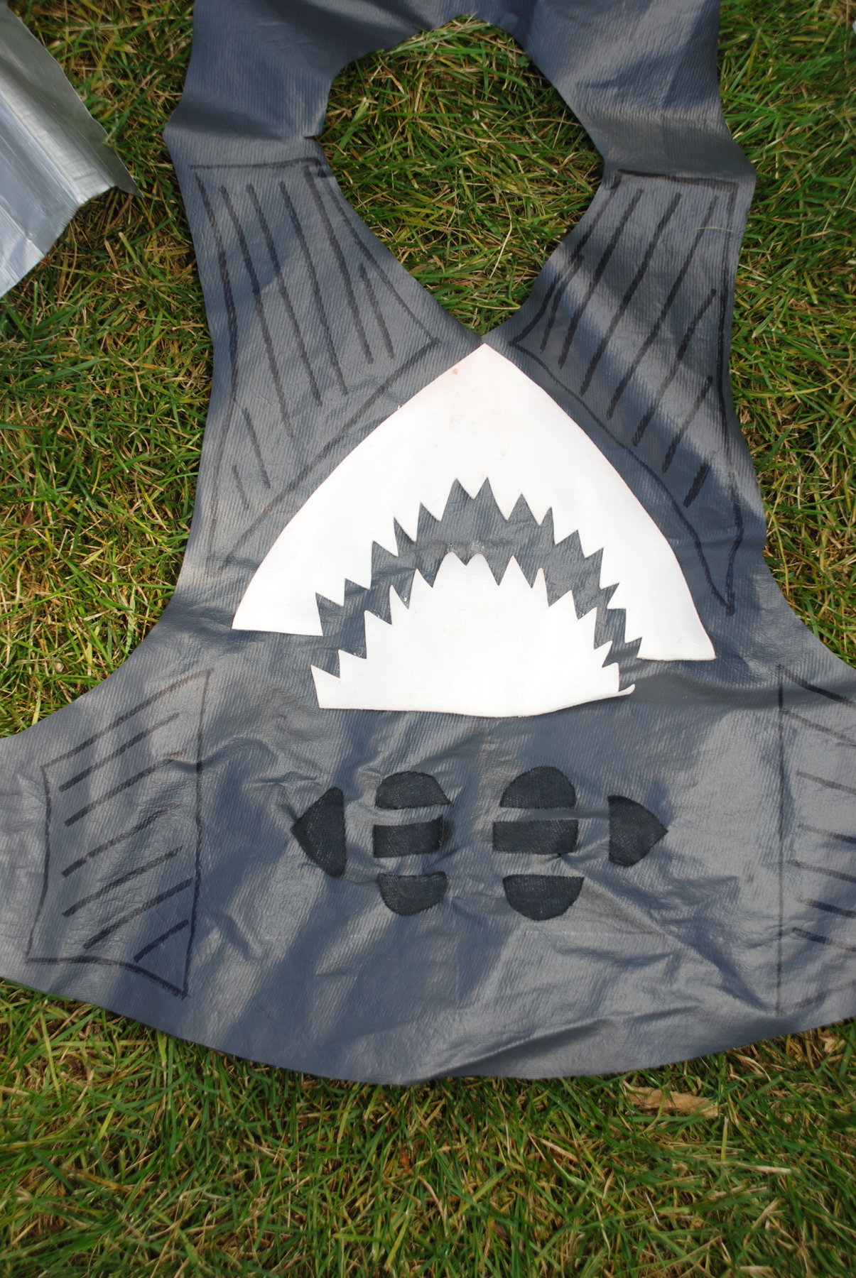 - Get out a shirt of the child you are making the costume for. Use the shirt as a template to draw out the shape and size of the shark “shirt” on the vinyl. My sister made the vinyl shirt so that it would slip over her son’s head and then velcro at the sides near his waist. See the picture of it below.