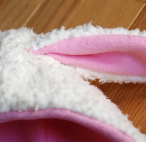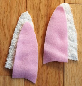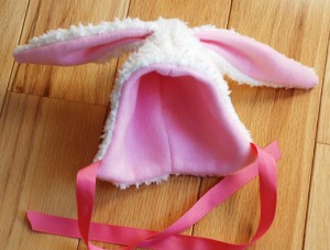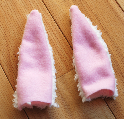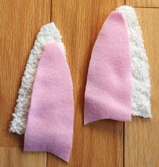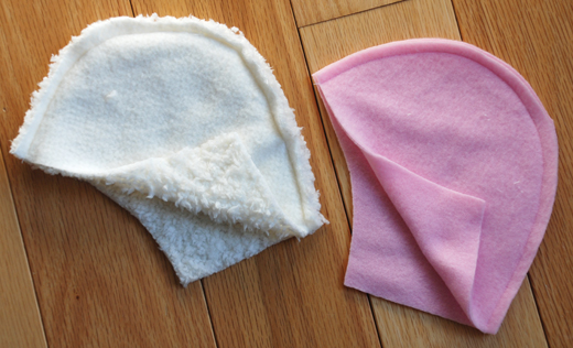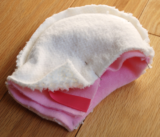 - Fold outer layer fabric with right sides together and pin pattern (main hat piece and ear) to fabric. Cut out main hat piece and ear. You should have two cut fabric pieces for each shape.