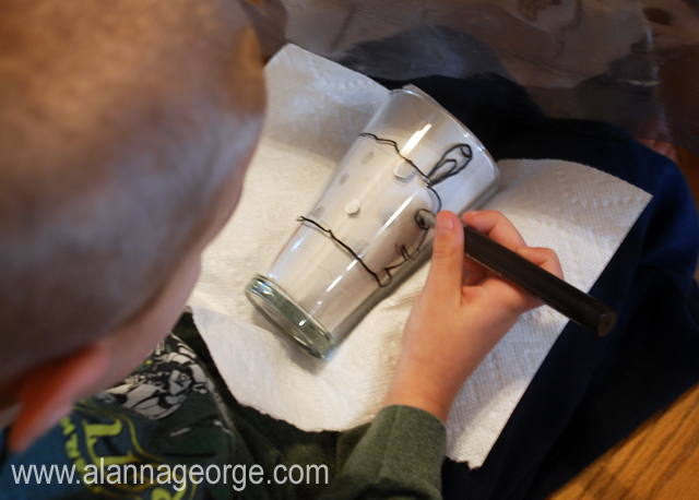 My 7 year old son made these drinking glasses to give as gifts to his siblings for Christmas. This is a really great kid craft! This year we are working on a new tradition. I am helping each child make a handmade gift for everyone in our family. Making special gifts makes my kids feel so excited and proud and since he loves to draw this was a natural fit. So you’ve seen what he made, don’t spill the beans to the rest of the family! Want to help your child make glasses like these? Read on to find out how simple they were to make!