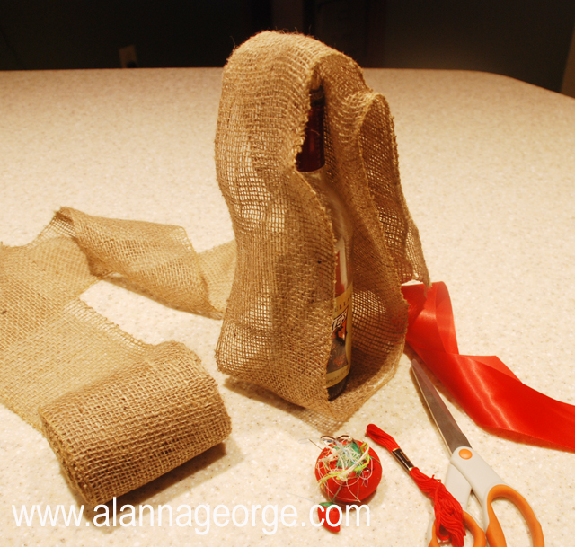 - Wrap the burlap garland up around the bag and cut off the needed length to cover your bottle.