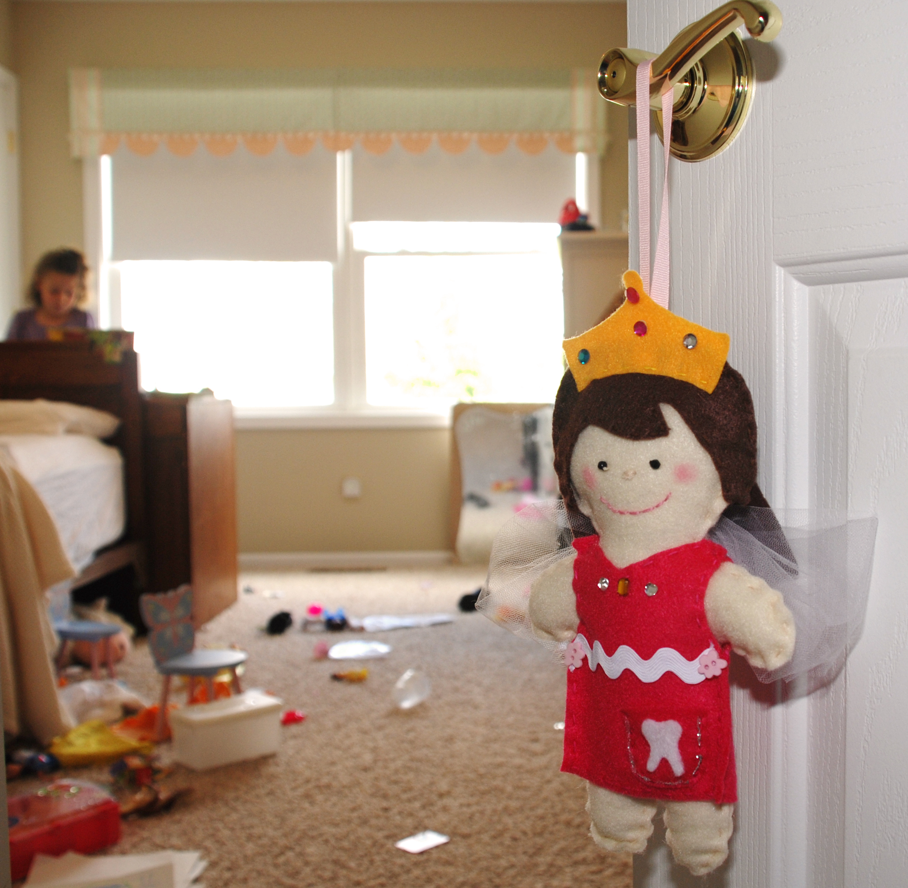 My daughter recently lost her first tooth. We created this felt fairy doll with tooth pocket to hang on her doorknob so the tooth fairy would have easy access to her lost tooth. We worked together to choose the color of the fairy’s hair and dress. After I was finished sewing it all together she decorated the doll with glitter glue, stick-on gems, ric-rac and buttons. I am glad to report that the tooth fairy had no problem locating her tooth in the pocket and leaving my daughter a surprise. (p.s. this what a 6 yr. olds room looks like on the average day!)