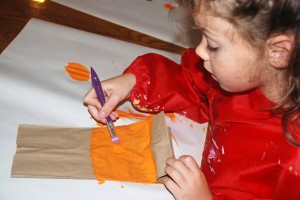 1. Paint the lower portion of the lunch bag orange. (Another option is to color the bags with markers, you can see a picture of colored lunch bag pumpkins below.) Make sure to open up the bag and paint all the sides. I found it easiest to open the bag and hold my hand inside while I painted.