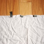 4. Cut strips of duct tape and stick them, evenly spaced, along the top edge of the white fabric. Go back and roll the duct tape down. (Pic. 2)