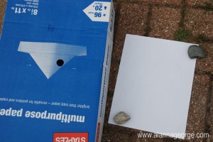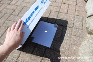 5. I also thought from all the instructions I viewed on the internet that you would put your eye right up to the hole and peer in at the projected image of the Sun. Okay, that might make me sound stupid, because it only took one look with my eye right up to the hole in the box with the super bright pinpoint image on that white paper to know that wasn’t a smart idea. So keep your face a short distance from the hole on the side of the box and position the project image so you can view it without sticking your eye right up to the hole. You can see the projected Sun image in my picture below and I didn’t put the camera very close to the hole.