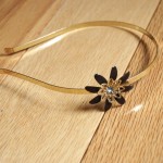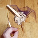 6. Add a generous amount of E6000 glue to the headband where you want the flower. (I covered up the metal flower on the headband by placing one of the fabric flowers directly on top of it.) Use a clothes pin or two to hold the flower in place while it dries. Repeat for the second flower. (Pic. 7)
