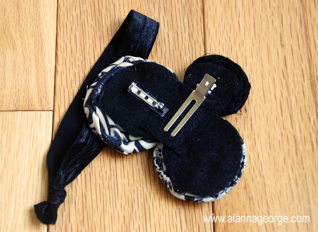 I have detailed instructions for making these flowers on a previous post. You can find the instructions here and more here. When I made the flowers in the instruction post I used a satin fabric and made the flowers look a little more loose and I sewed pearls in the center. For the flowers above I used a cotton, quilting type of fabric and wrapped the fabric a little tighter. I also rolled the center instead of tying a knot, which gave the flowers a little bit of a different look. The fabric I used is by Riley Blake Designs and it has glitter already on the fabric, which gave these flowers a pretty shine when they were finished.