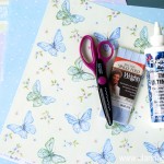 1. With a piece of patterned paper laid out, trace a large circle onto it. You can trace around the edge of a large bowl (that is what I did) or cut out a 12″ diameter circle template from a piece of paper.