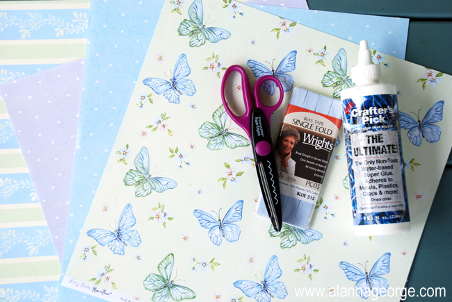 5. Lay out your bias tape. Open up the edges of the bias tape and slide the straight edge of the paper scallop inside. Glue each scallop to the bias tape by adding glue along the top of the straight paper edge. Let dry.