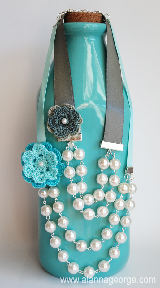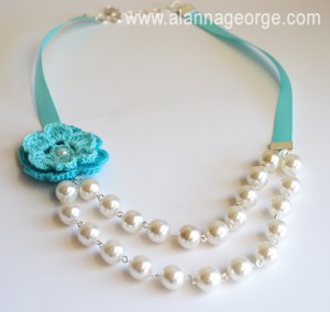 5. Use E6000 glue to adhere the crocheted flowers and pearl to your necklace. Let dry.