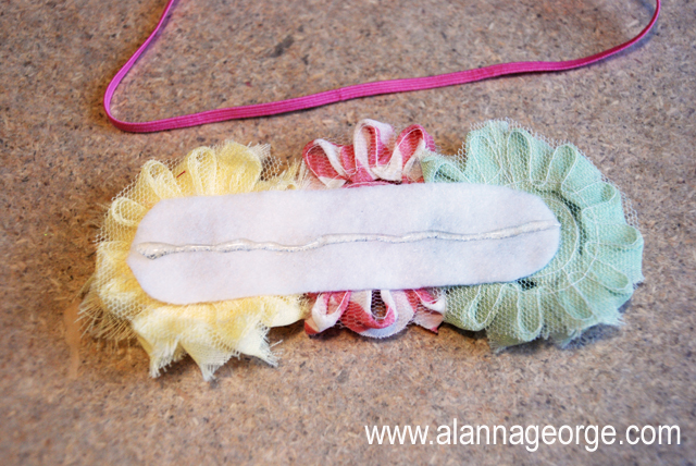 5. Place a line of hot glue on the back of the felt and glue on the elastic band.