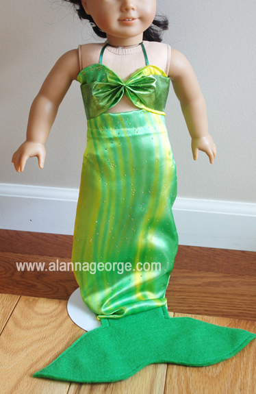 Beautiful mermaid costume for American Girl Doll, standard 18″ doll or Bitty Baby. Lime swim style handmade mermaid costume. Two pieces. Tail with Velcro closure on waist. Top with Velcro closure on back and ribbon tie around neck. Doll and stand not included. Shipping is included in the price.