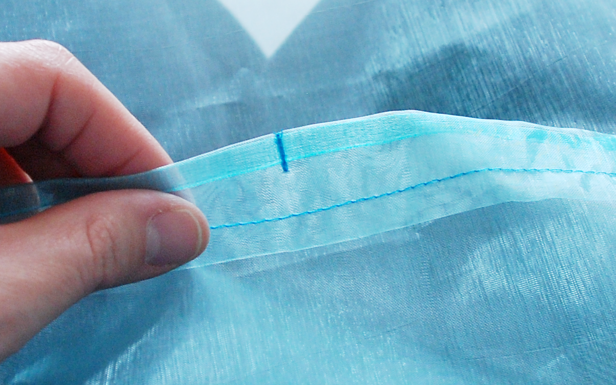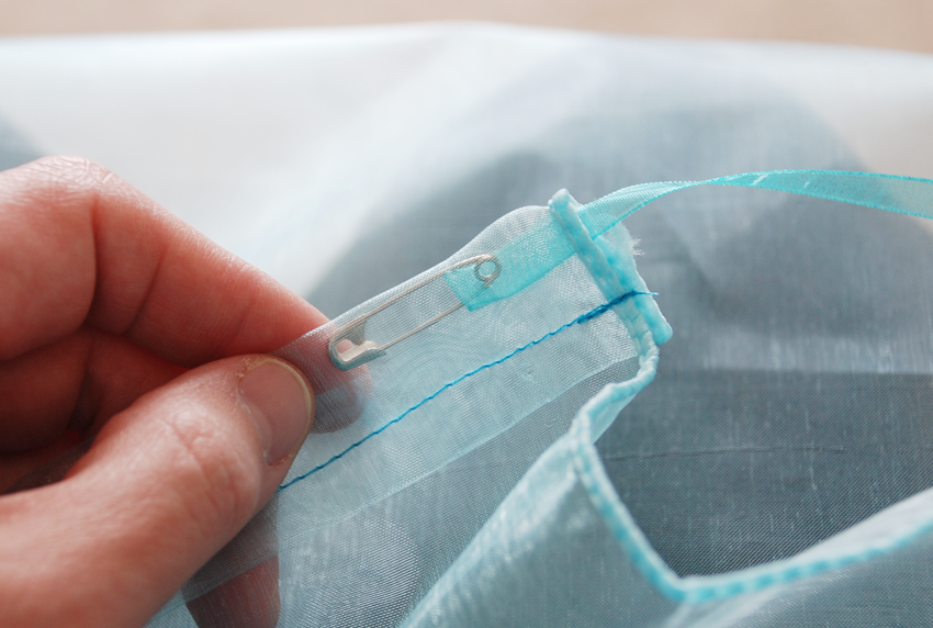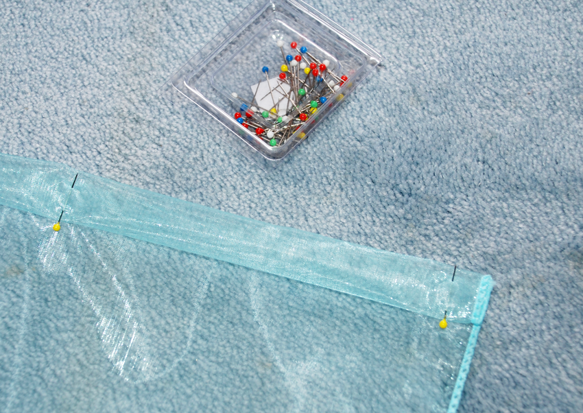 Fold the unfinished edge over twice and pin. This will create a tube for you to thread the ribbon through to create the tie for the cape.