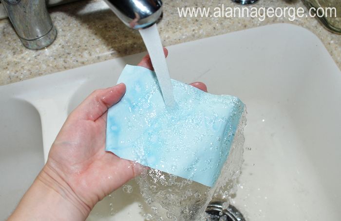 7. Rinse the entire piece of Sun Paper with water. Squeegee excess water off by running the paper between your first two fingers. Lay the wet Sun Paper on a towel to dry.